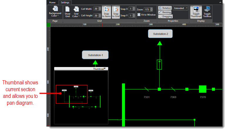 You can view a thumbnail perspective of the area of the diagram currently visible on the canvas and then pan to different parts of the diagram. This feature is useful as you zoom in and out of a diagram and then want to change the focus to different sections of the diagram.