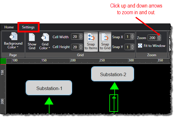 You can zoom in and out of diagrams to enlarge a specific area or fit more of the diagram on the screen. The easiest way to zoom in and out is to hover your mouse cursor over the diagram and then scroll up and down on your mouse. You can also use the zoom commands on the Settings ribbon.