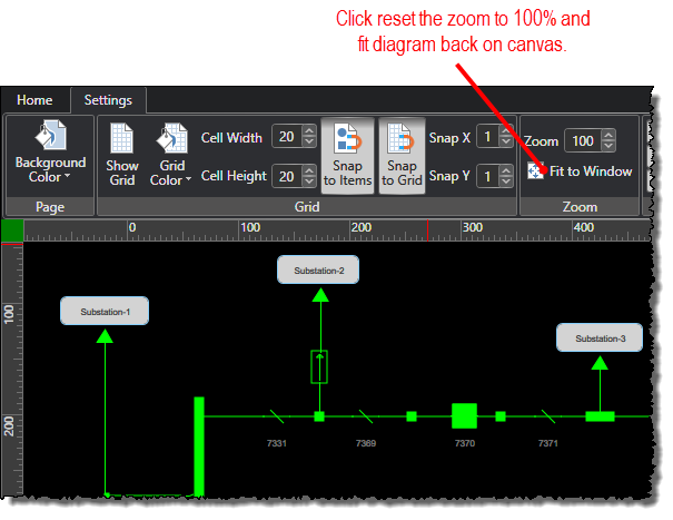 To reset the zoom back to 100% and place the diagram in the viewable portion of the canvas, click the Fit to Window command.