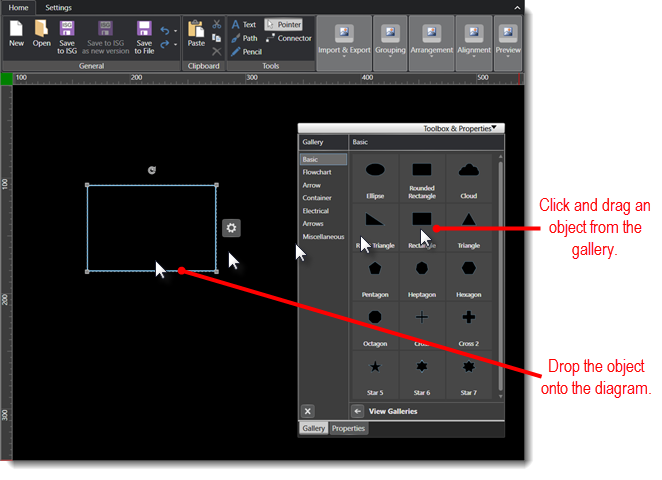 Click and drag an object from the gallery, and then drop the object onto the diagram.