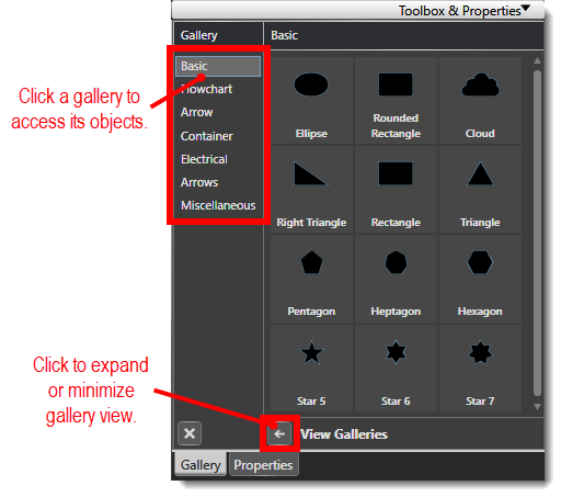 The free-form drawing toolbox provides galleries of standard shapes and electrical symbols that you can add to a new or existing diagram that is open on the canvas.