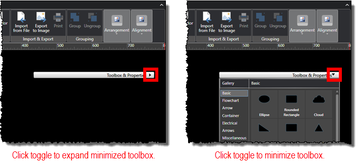 You can minimize and expand the toolbox by clicking the toolbox minimize/expand toggle.