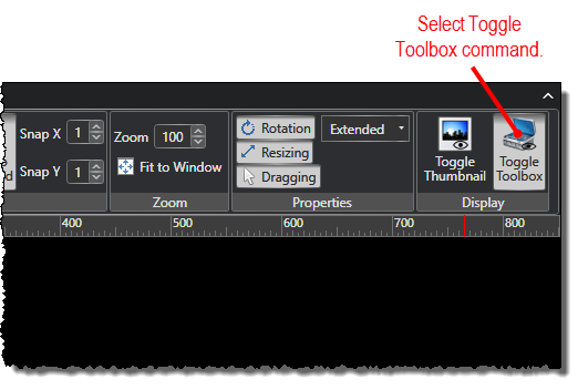Click to deselect the Toggle Toolbox command to hide the toolbox.