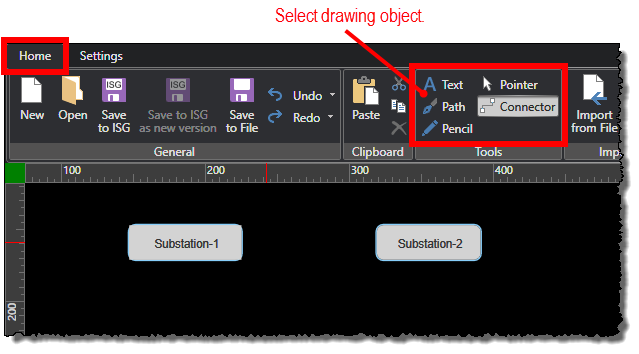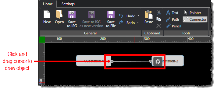 Click and drag the cursor to draw the selected object. For example, with Connector selected, you could draw a connecting line to show a connection between substation buttons.