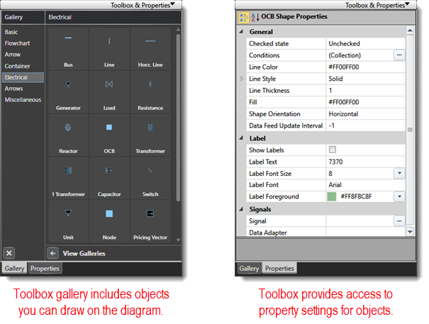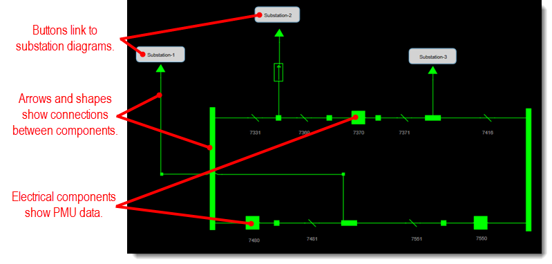 This diagram includes electrical components, arrows, shapes, and substation button links. You can draw these objects and set their properties, data sources, and conditional behaviors using the free-form toolbox.