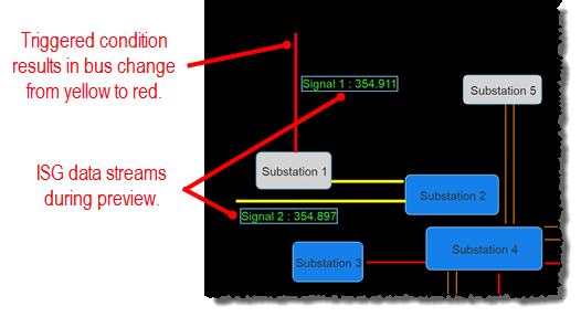 When you start the preview, the real-time data feed from your ISG starts, and signal values are shown with the mapped objects. If any conditional actions are specified for an object, the action is taken on the object if the condition is triggered. For example, a bus color could change from yellow to red if a condition is set to do so when the voltage exceeds a predefined threshold.