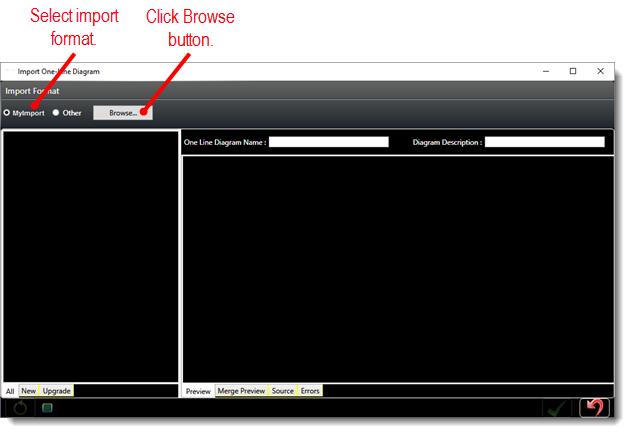 When the Import One-Line Diagram screen opens, select the file format option for the file you want to import, and then click the Browse button.