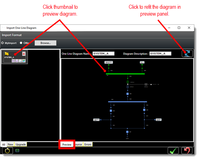 When the file is loaded to the Import One-Line Diagram screen, a thumbnail appears for each diagram. Click a thumbnail to preview the corresponding diagram on the Preview tab. While previewing a diagram, use your mouse scroll wheel to zoom in and out of the diagram. You can refit the diagram in the preview panel at any time by clicking the refit icon (