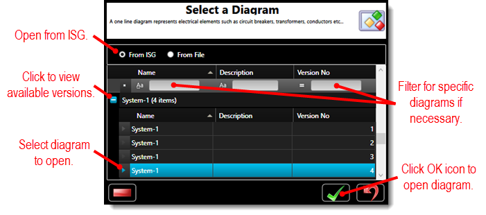 When the Select a Diagram screen opens, select the From ISG option if it is not already selected, and then select the diagram you want to open. If the diagram has multiple versions, you can select any of them. If you have a large list of diagrams, you can use a filter to find a specific diagram.