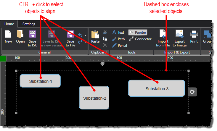 While you could use the canvas grid to align the objects manually, you can quickly and more accurately use the object-alignment feature.