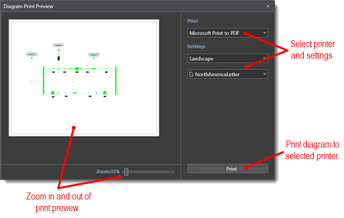 When the Diagram Print Preview window opens, select your printer and settings and then click the Print button.